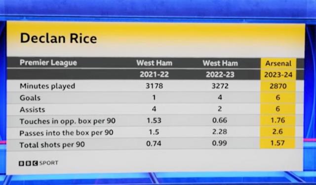 赖斯近3个赛季数据,本赛季出场时间少的情况下,进球、助攻、对手禁区场均触球数、场均传入对手禁区数以及场均射门全面提升。