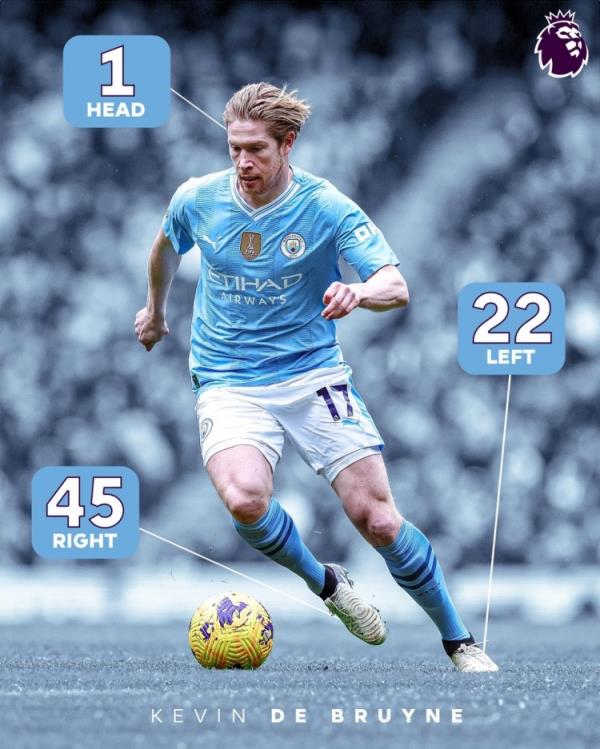 据英超官方统计,德布劳内英超68球中45球由右脚打进、22球左脚打进,战布莱顿的鱼跃冲顶是丁丁英超生涯首次头球破门。