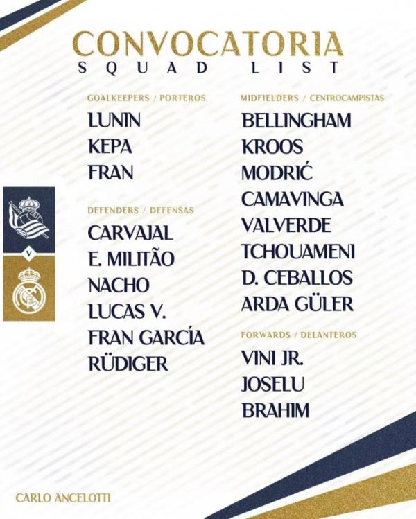皇马官方公告写道:“今晚皇家马德里将前往圣塞巴斯蒂安对阵皇家社会,贝林厄姆入选了球队大名单。”