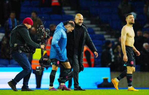 04月26日讯 英超第29轮补赛,曼城4-0战胜布莱顿,福登梅开二度,并解锁英超50球里程碑。赛后瓜迪奥拉也是非常满意福登的表现,亲昵地抚摸爱徒的头。